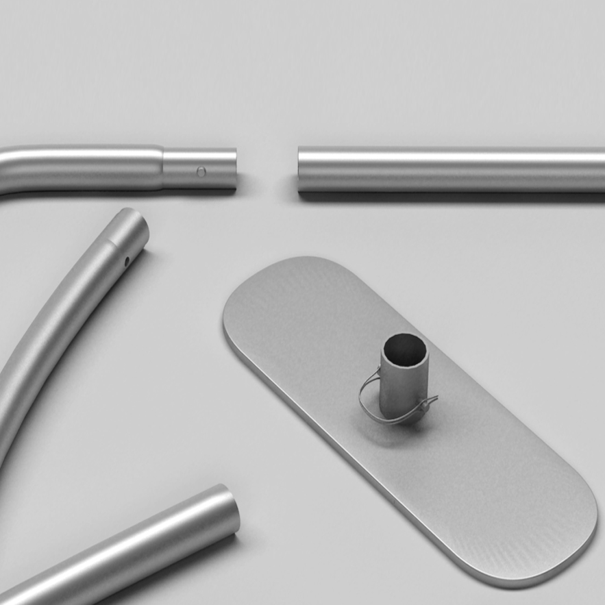 Eloxiertes Aluminiumstecksystem D=34 mm mit mittiger Stabiliserungsstange (D=20 mm) mit Sicherheitsclip, sowie pulverbeschichteter Stahlfuss.