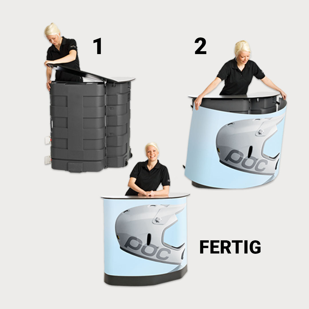 Praktische Transportbox und Theke mit bedruckter Bespannung und Einlegeböden in einem. Die Theke bietet eine große Werbefläche, die mit individuell bedruckter Stoffbespannung mittels Klettband leicht ausgestattet werden kann. Einlegeböden bieten reichlich Stauraum und Ablageflächen für Infomaterial und alles, was nicht sichtbar sein soll.