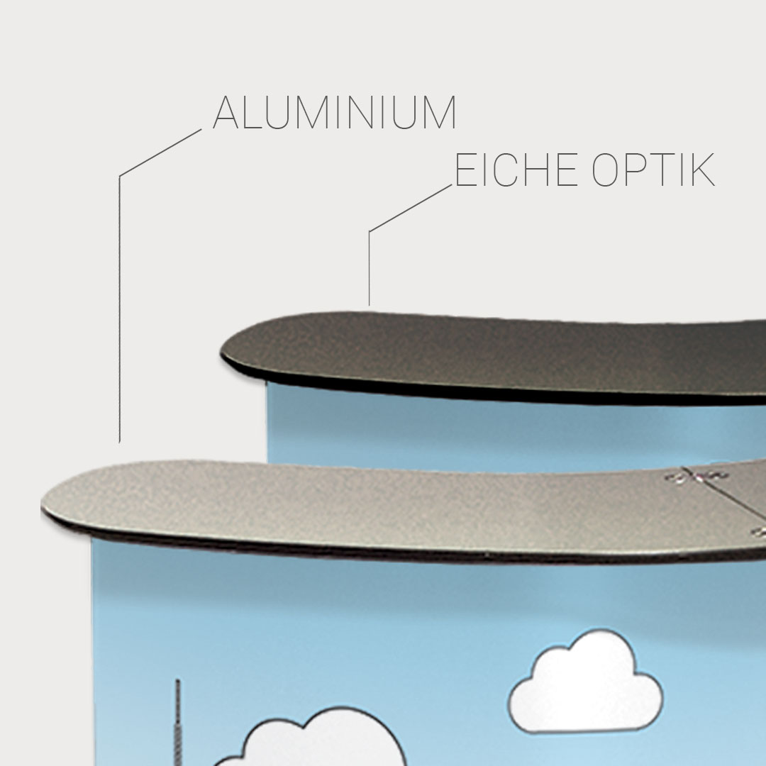 Die Theke bietet eine große Werbefläche, die mit individuell bedruckter Stoffbespannung mittels Klettband leicht ausgestattet werden kann. Einlegeböden bieten reichlich Stauraum und Ablageflächen für Infomaterial und alles, was nicht sichtbar sein soll.
