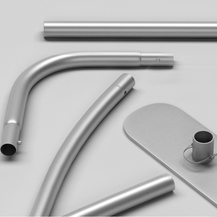 Eloxiertes Aluminiumstecksystem D=34 mm mit mittiger Stabiliserungsstange (D=20 mm) mit Sicherheitsclip, sowie pulverbeschichteter Stahlfuss.