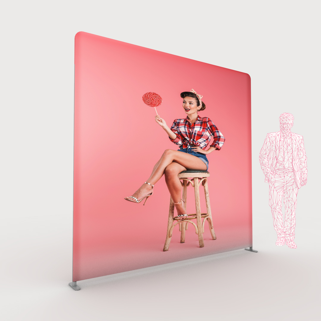 Die Clicktube ist eine leichte, moderne Variante einer Messewand. Da sie rundherum von der Bespannung umhüllt ist, kann sie sehr gut frei stehend eingesetzt werden.