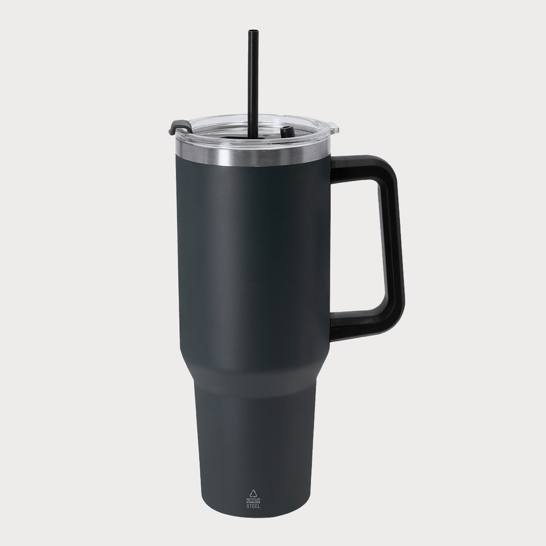 Thermobecher mit 1,2 L Fassungsvermögen, hergestellt aus recyceltem Edelstahl. Mit ergonomischem PP-Tragegriff für mehr Tragekomfort.